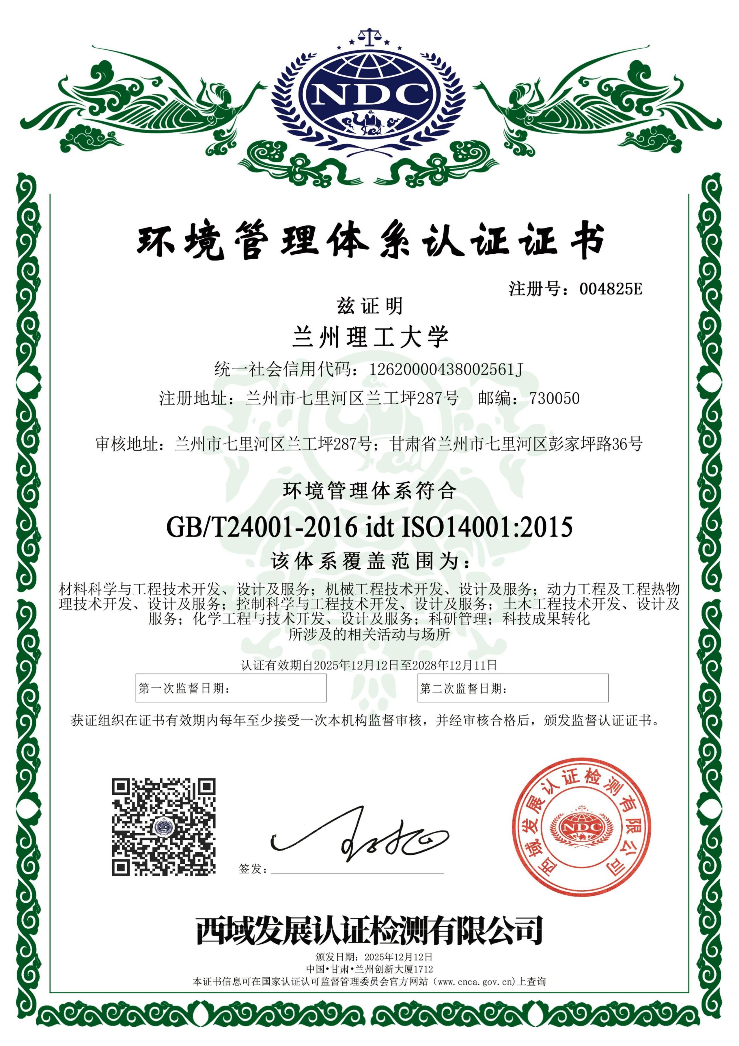 兰州理工大学——环境管理体系认证证书