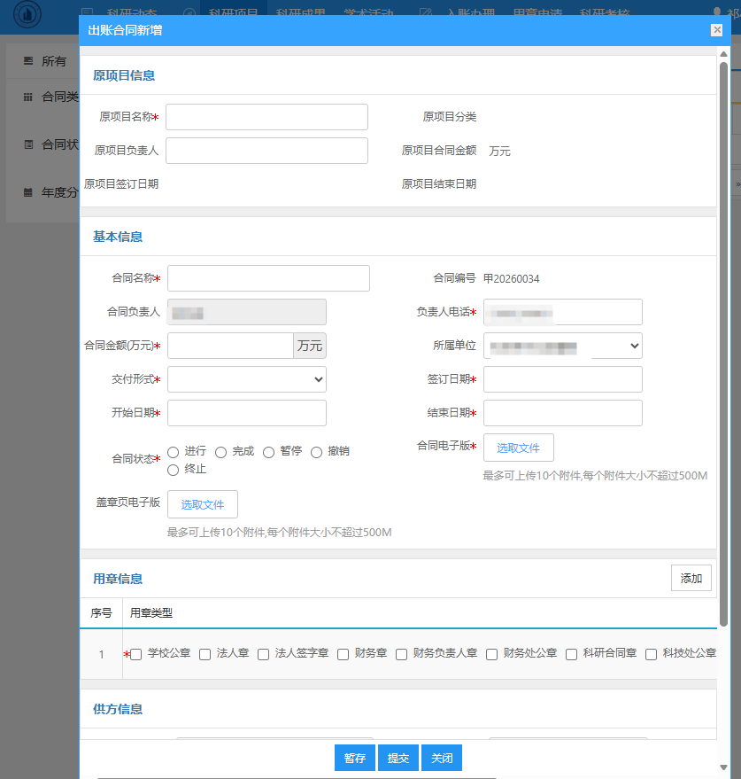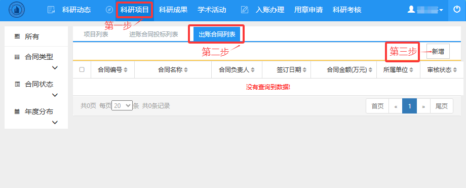 第三步:点击“新增”。在出账合同新增界面录入“原项目名称、合同名称、合同金额、开始日期、签订日期、结束日期”等信息,并上传“合同电子版”,无误后提交,等待学院审核、学校审核,学校审核通过后用印。