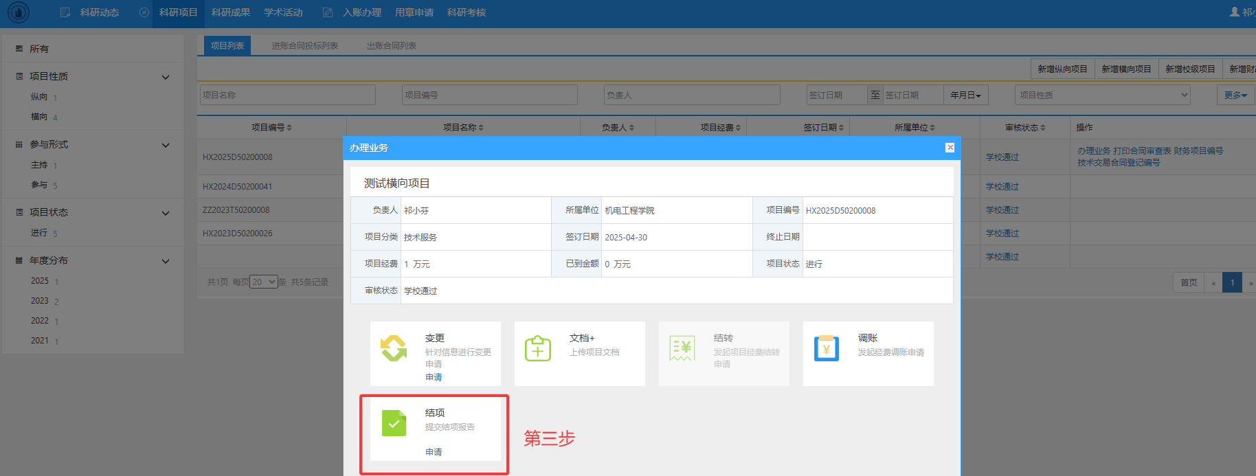 第二步:在项目列表选择需要办理结题的项目,右侧点击“办理业务”。