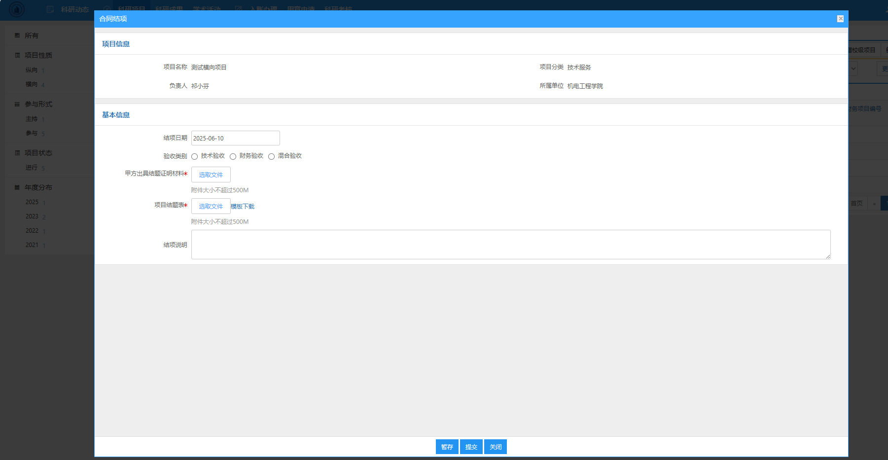 第四步:在合同结项界面录入“结项日期、验收类别”,并上传“甲方出具结题证明材料 (带鲜章扫描件)”、“项目结题表(带鲜章扫描件)”,无误后提交,等待学院审核、学校审核,学校审核通过后完成结题。