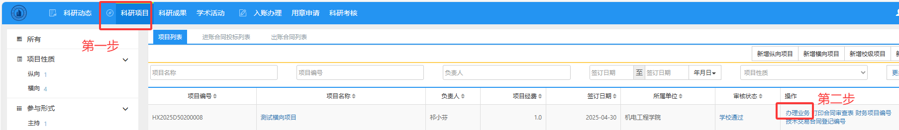 第一步:点击左上角“科研项目”。